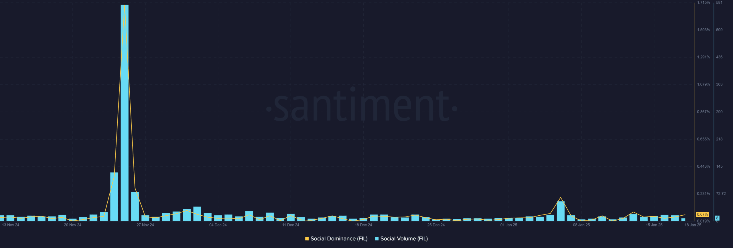 Despite the breakout, FIL’s social volume and dominance remain surprisingly low though, with just 8 mentions recorded. This muted social activity highlighted the limited engagement from retail traders, which often fuels market rallies.