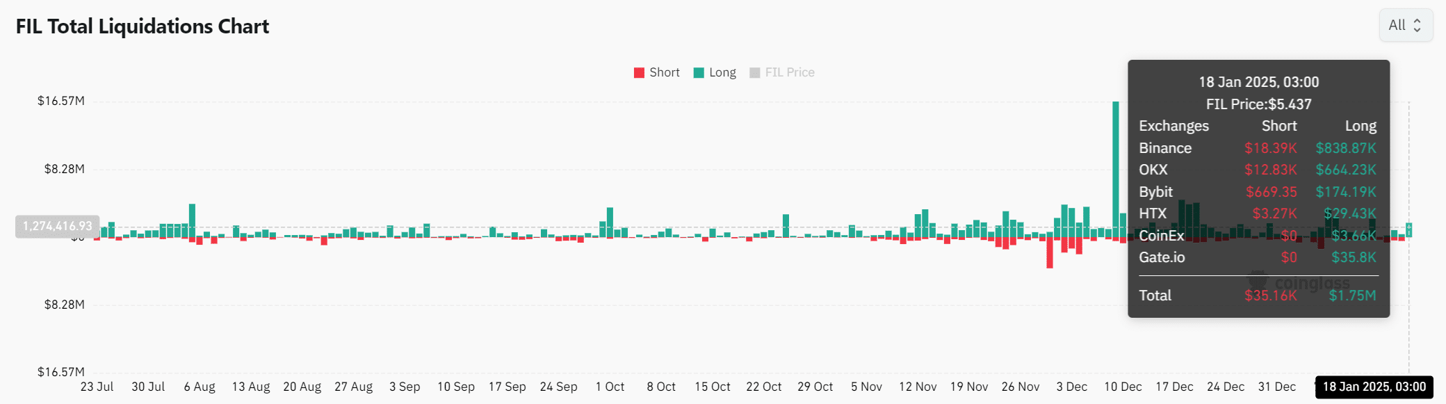 Finally, Filecoin’s Open Interest fell by 5.79% to $324.7M, indicating declining leveraged positions. Moreover, total liquidations stood at $1.75M, favoring longs, underscoring traders’ lack of confidence.