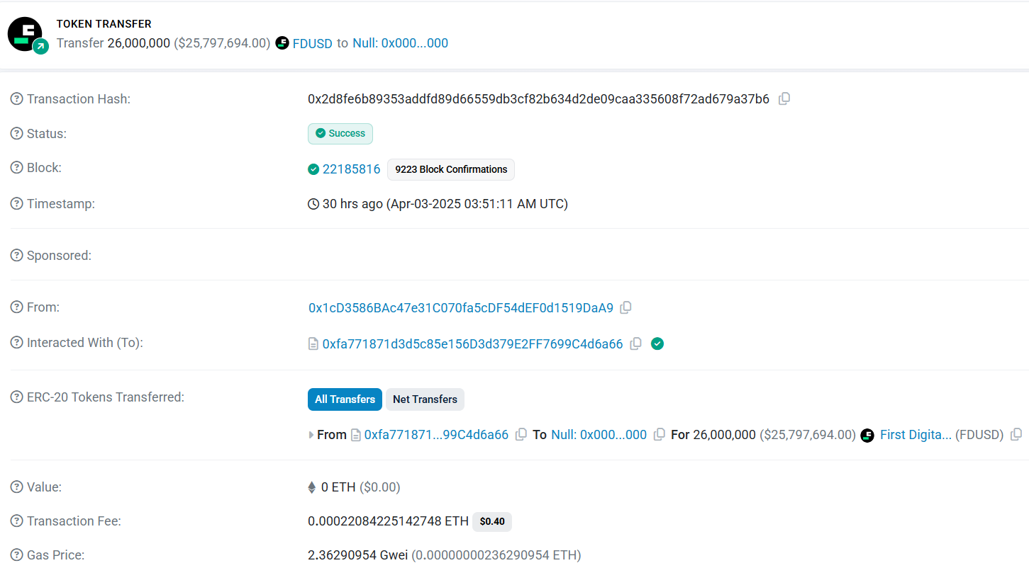 Despite the claims, blockchain data from Etherscan shows First Digital has honored about $25.8 million in FDUSD redemptions since the incident.