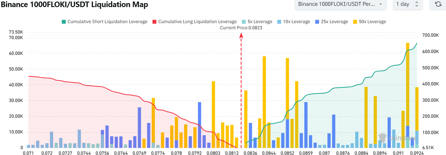 The 20 and 50-period moving averages were dynamic overhead resistances. They showcased the bearish market structure of FLOKI. The $0.000135 level, almost 62% above current prices, was the most recent lower high.