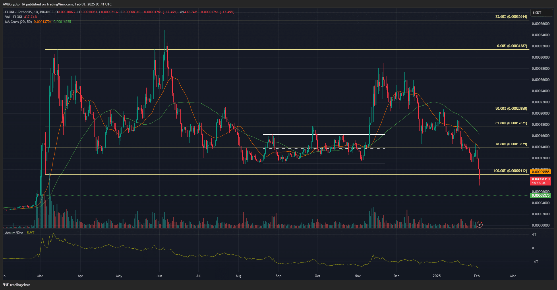 FLOKI [FLOKI] has fallen 58% since the early January highs at $0.000201. The A/D indicator noted persistent selling pressure alongside the price losses, making a quick recovery unlikely.
