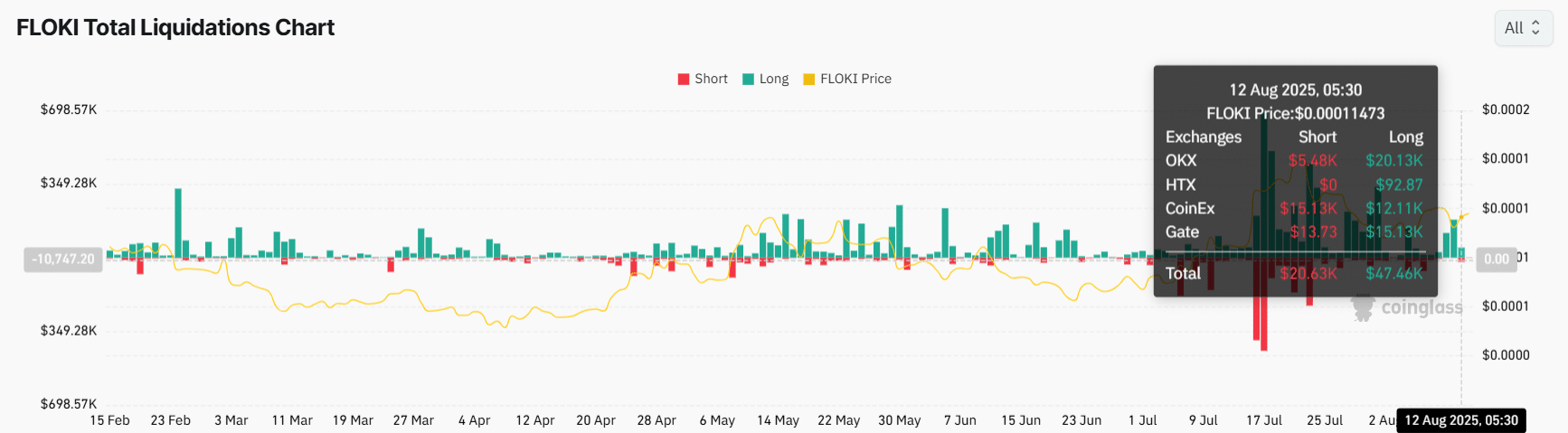 At the time of writing, FLOKI’s $68.09K in total liquidations leaned heavily toward long positions, with $47.46K wiped out compared to $20.63K in shorts.