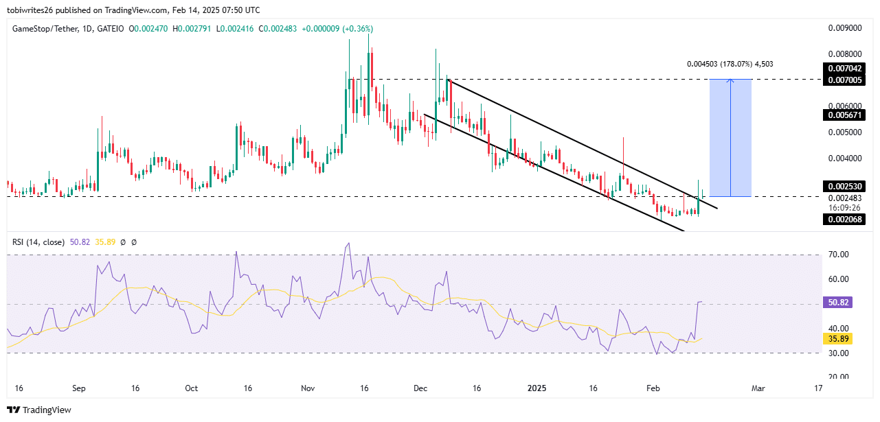 If GME reclaims this level, it could see a 178% rally, reaching $0.0070 and establishing a new high. However, failure to trade above this support level could result in GME returning to the descending channel.