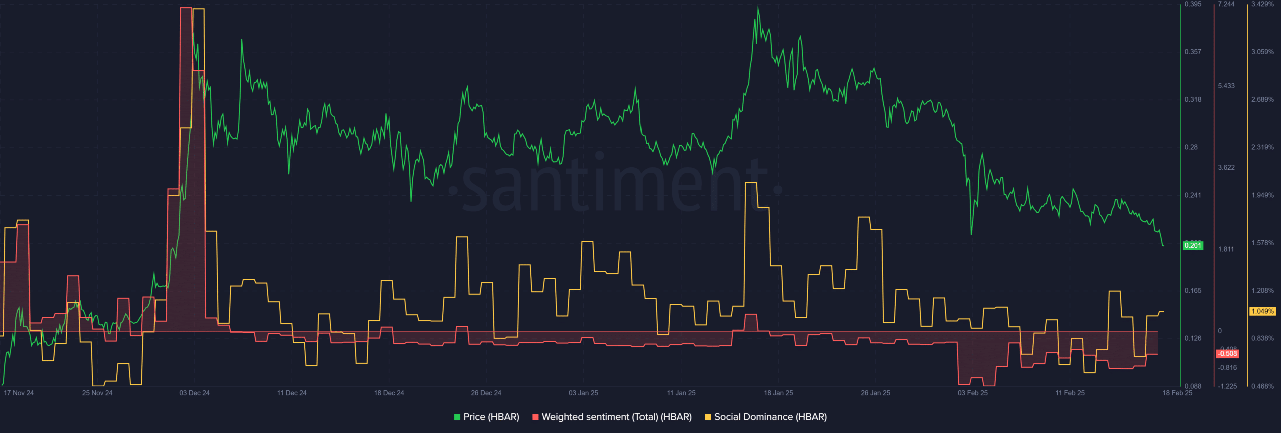 Social Dominance, which is a measure of the token’s volume as a fraction of 50+ of the most popular crypto assets mentioned on social media, has been falling since mid-January.