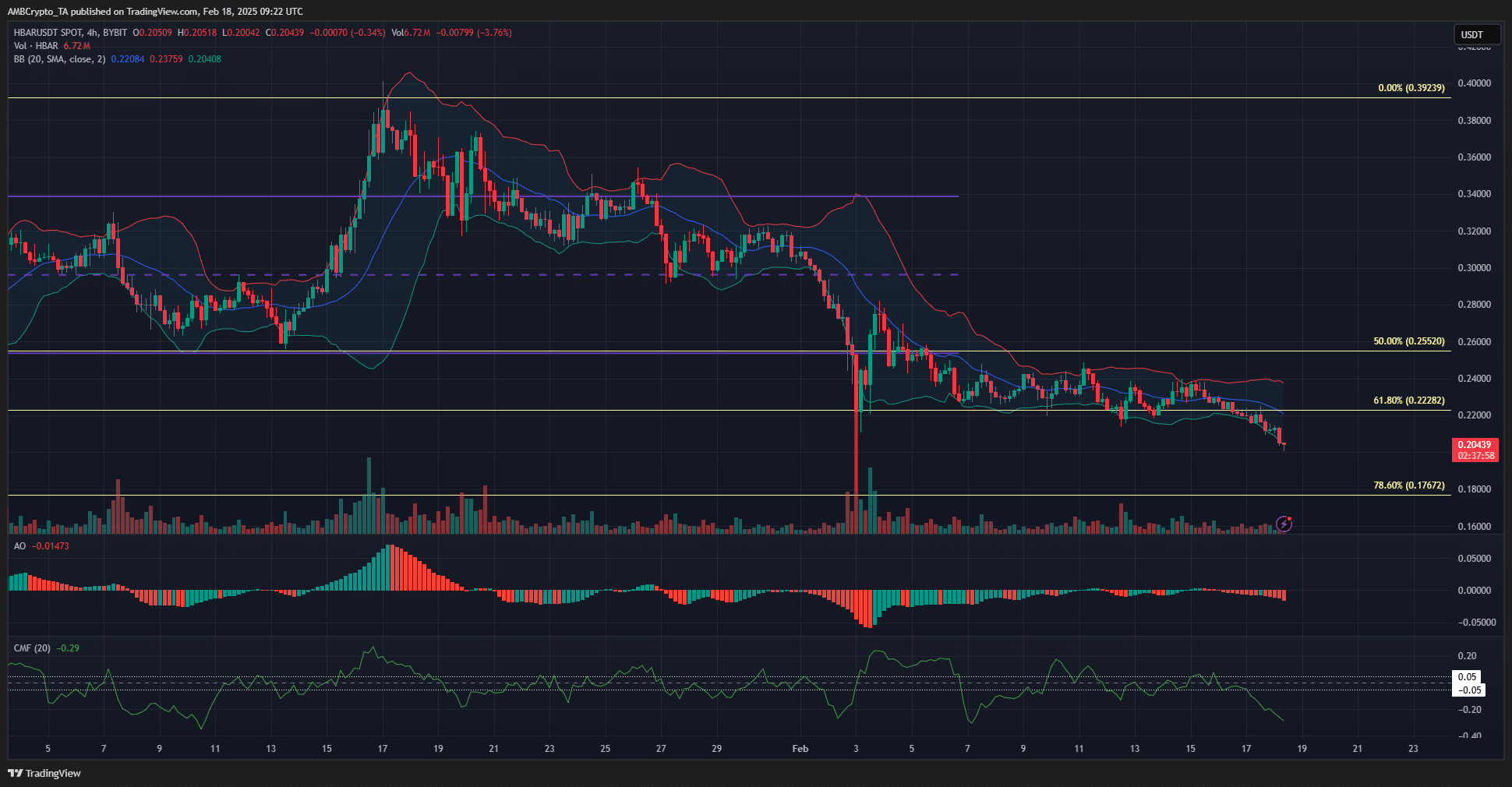 The HBAR Awesome Oscillator made a bearish crossover, and the CMF fell below -0.05. The Bollinger bands began to expand as the losses intensified.