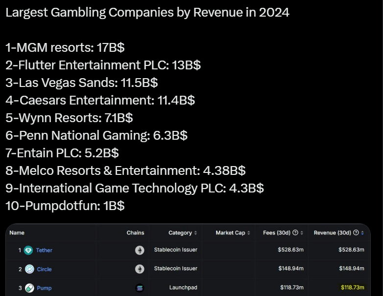 According to SigmaSquared on X, Pump.fun made $1B in revenue in 2024. It also ranked 10th among top “gambling” companies of the year.
