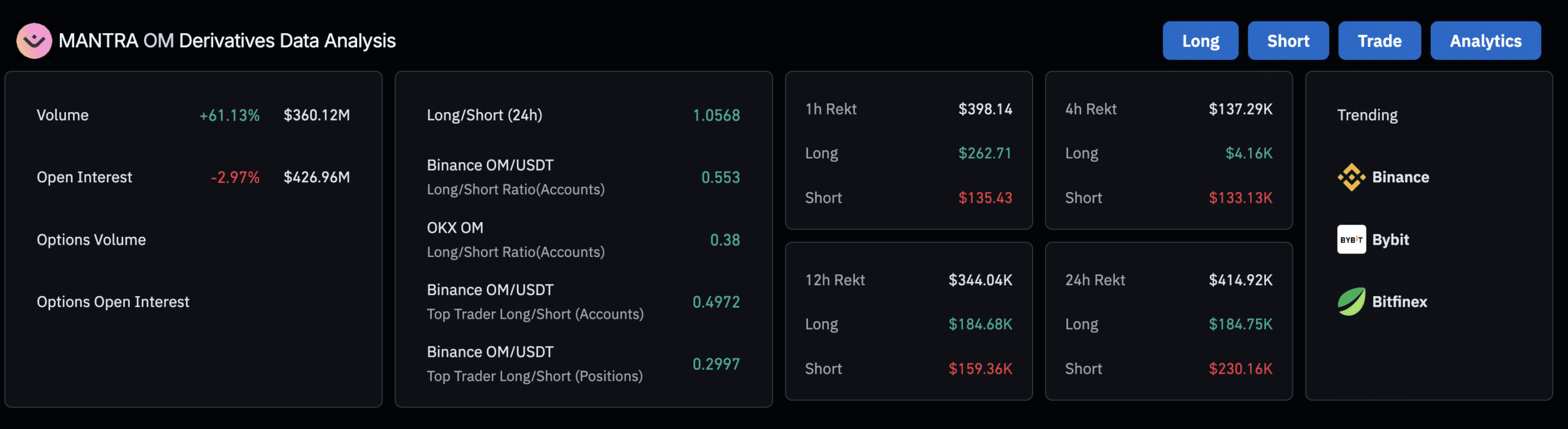 Trading volume surged by nearly 60% to $361.3M – A sign of renewed interest in OM’s Futures market. On the other hand, Open Interest dropped by 3% to $429M, indicating that some traders exited positions after OM hit its all-time high.