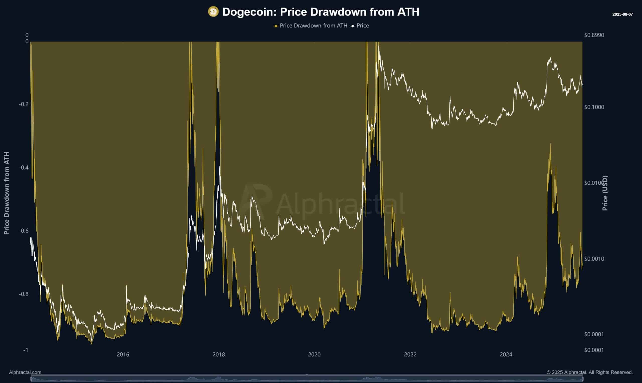 DOGE has dropped to an extreme drawdown from its all-time high, suggesting a rebound may be closer than expected. At press time, the drawdown sits below -0.6.