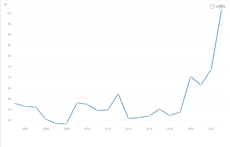 El Salvador’s national debt as a percentage of GDP. Source: World Bank