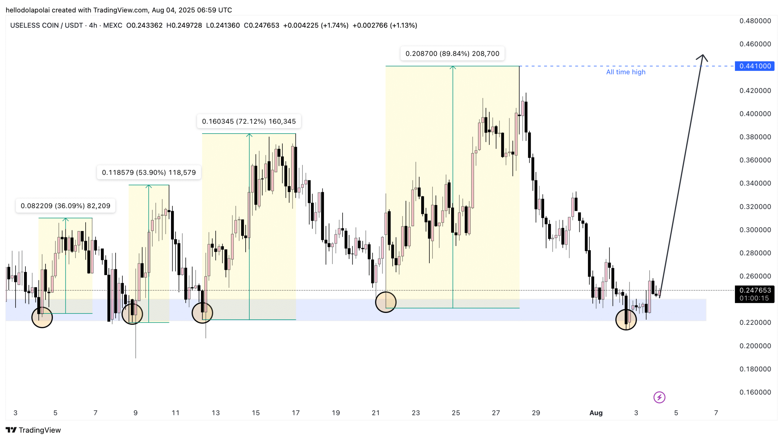 Each time prices touched this level, they rebounded sharply and reached a new peak. If this pattern holds, USELESS could surpass its previous all-time high of $0.441, set on July 28.