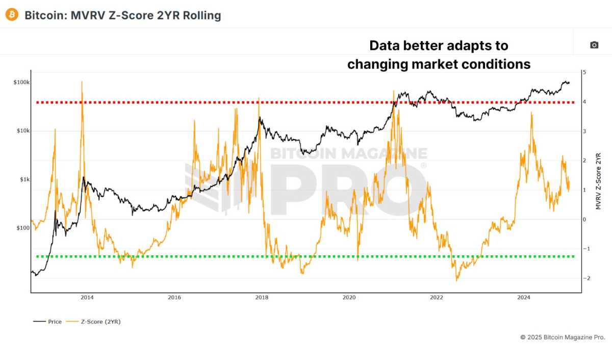 The MVRV Z-Score standardizes the raw MVRV data using Bitcoin’s entire price history, which includes the extreme volatility of its early years. As Bitcoin matures, these early data points may distort its relevance to current market conditions. To address these challenges, we’ve developed the MVRV Z-Score 2YR Rolling. Instead of using Bitcoin’s entire price history, this version calculates volatility based only on the previous two years of data.