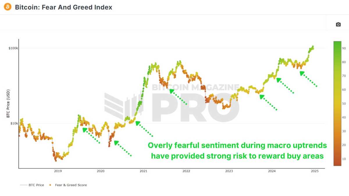 Figure 3: The Fear and Greed Index highlights moments of extreme fear during macro uptrends, which historically align with strong risk-to-reward buying opportunities for Bitcoin.