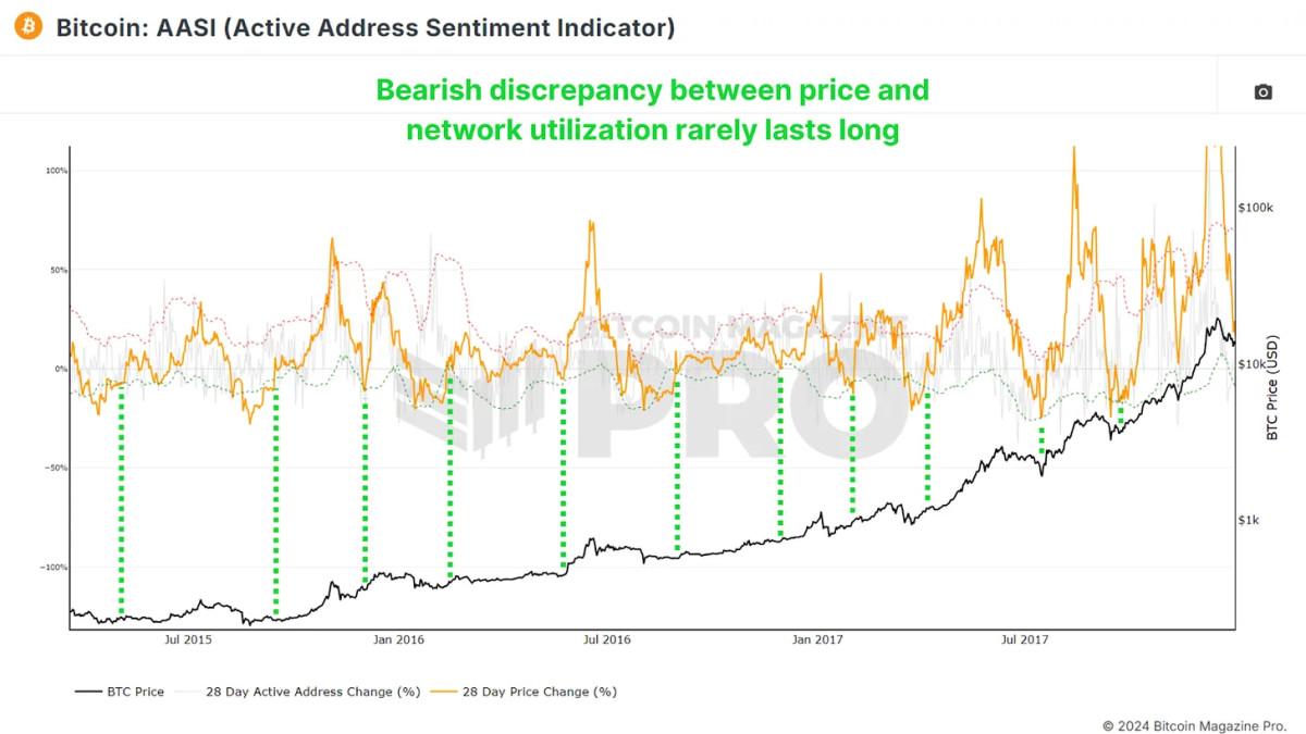 This tool measures the divergence between Bitcoin’s price and network activity, when we see a divergence in the Active Address Sentiment Indicator (AASI) it indicates that there’s overly bearish price action given how strong the underlying network usage is.