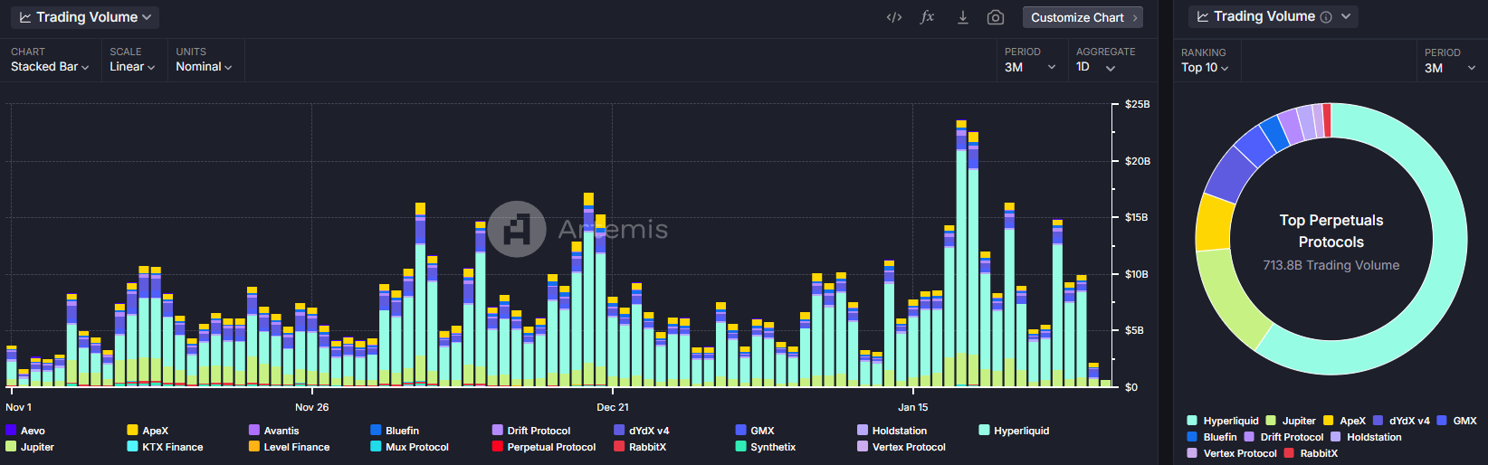 Of the total $713.8 billion traded in the last three months across the top 10 protocols, Hyperliquid accounted for $419.1 billion or 59.6%.