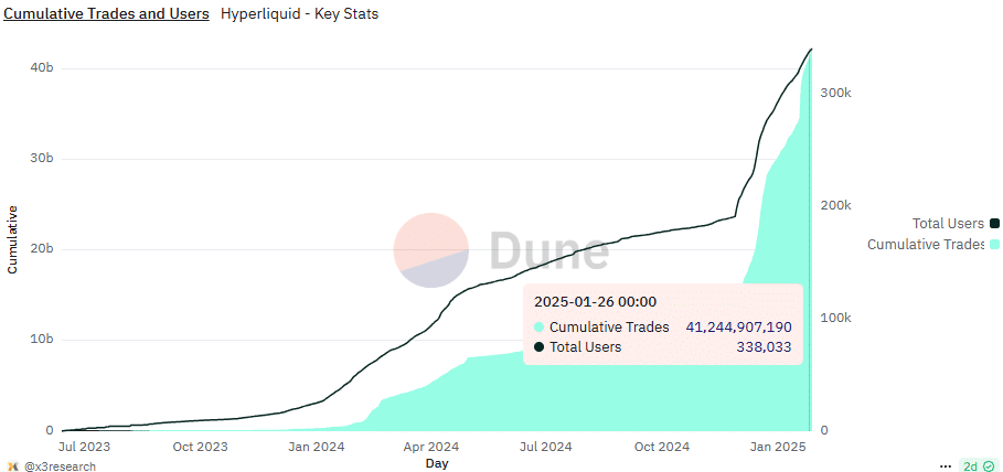 In a post on X, crypto analyst Miles Deutscher pointed out that the cumulative Hyperliquid trades and total users count have been rising swiftly. This hinted at greater adoption and a “project that found a strong product-market fit.”