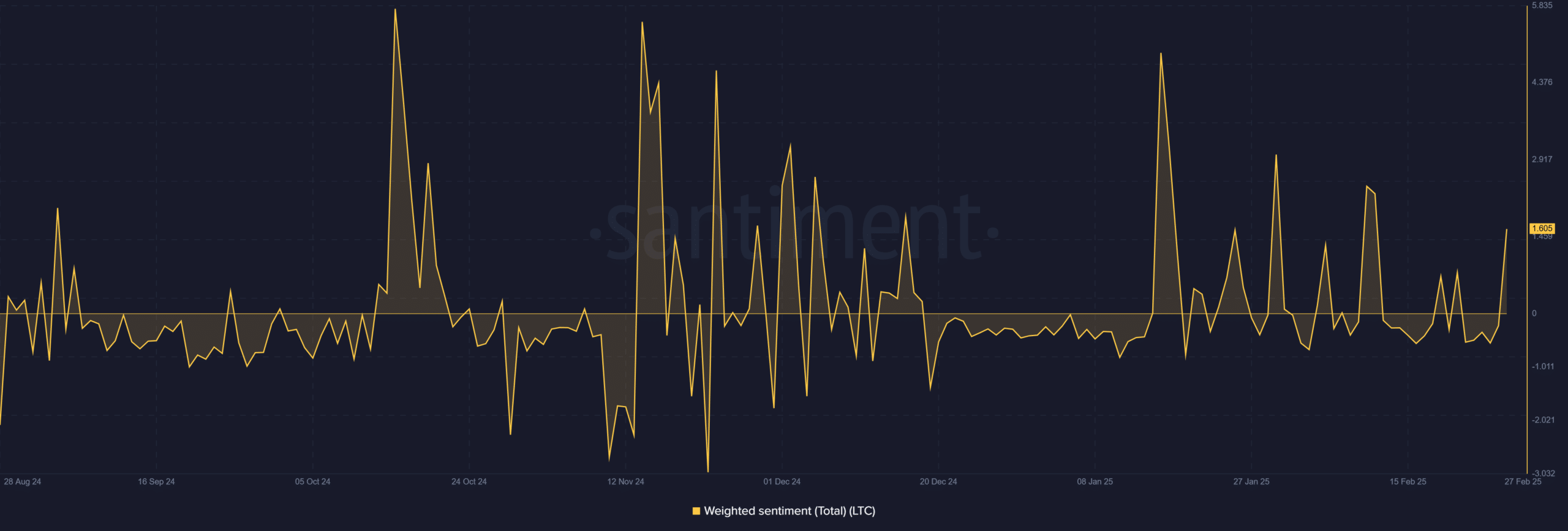 Finally, the weighted sentiment around Litecoin has also been improving. At press time, the sentiment had reached 1.60, up from previous months. This hike in sentiment reflected growing optimism in the market, which could encourage further buying activity.