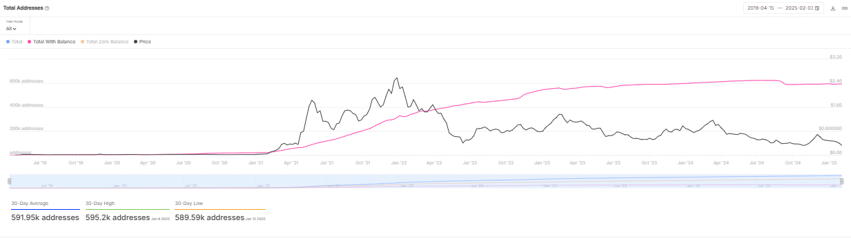 During this period, the total address count and addresses with balances exhibited a correlation with the token’s price. It saw its highest peaks and sharpest declines in 2021 and 2022, respectively.