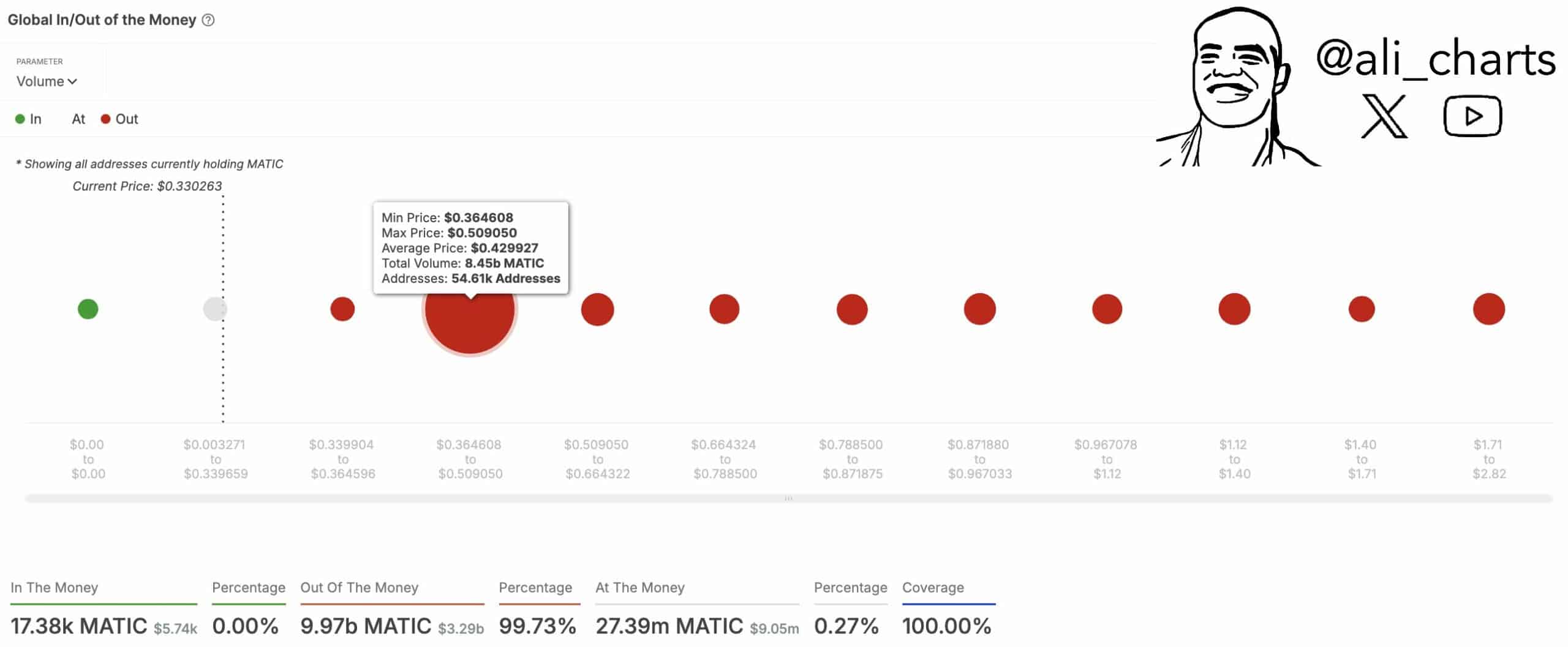 Polygon’s (POL) on-chain data underlined a concentration of accumulation within the price range of $0.364 to $0.509. This range, where about 9.97 Billion POL seemed to be out of the money, pointed to the importance of these levels as potential support or resistance zones.