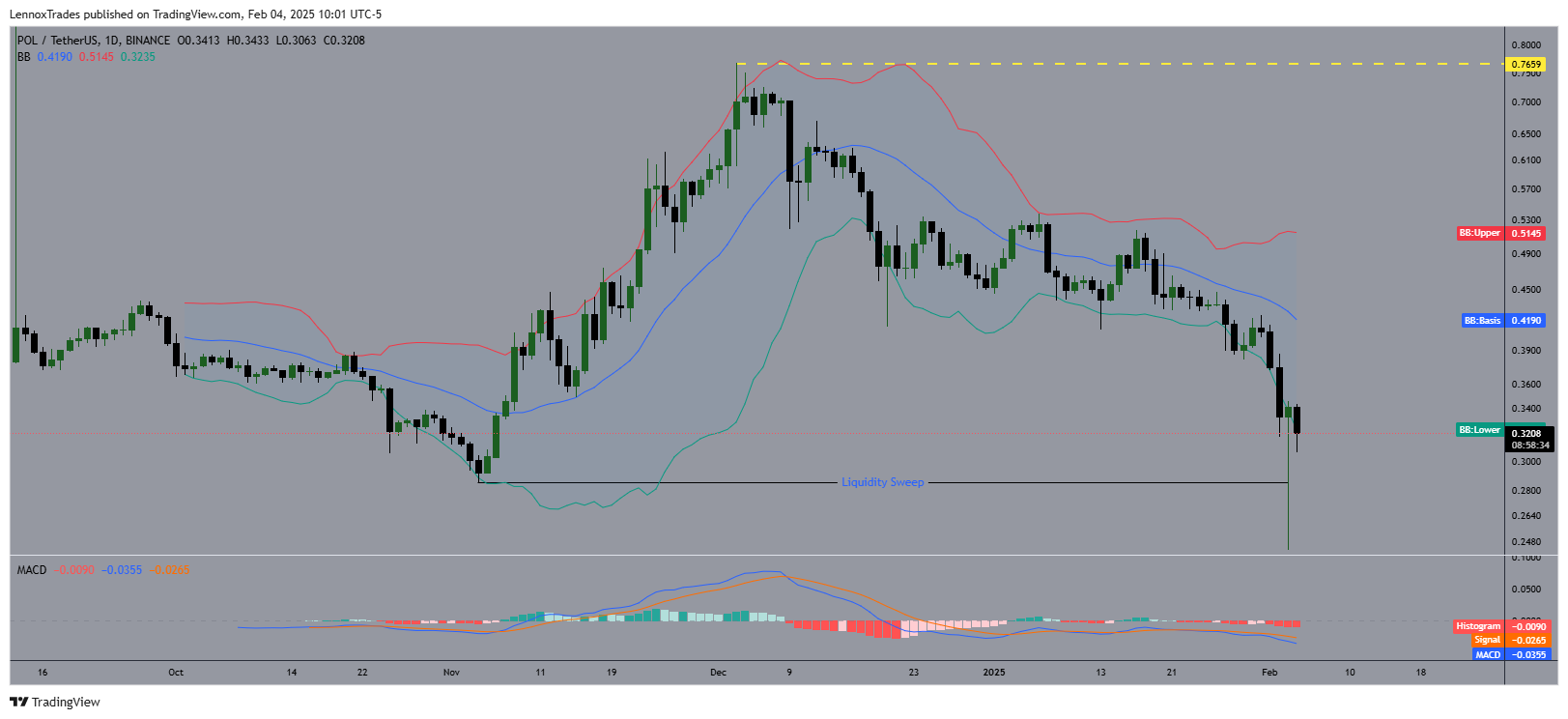 The POL/USDT pair revealed a pattern following a liquidity sweep, as indicated by a sharp volume hike and a brief price surge. Subsequently, POL ascended, peaking at $0.515, before entering a downturn that intensified in late January 2025.