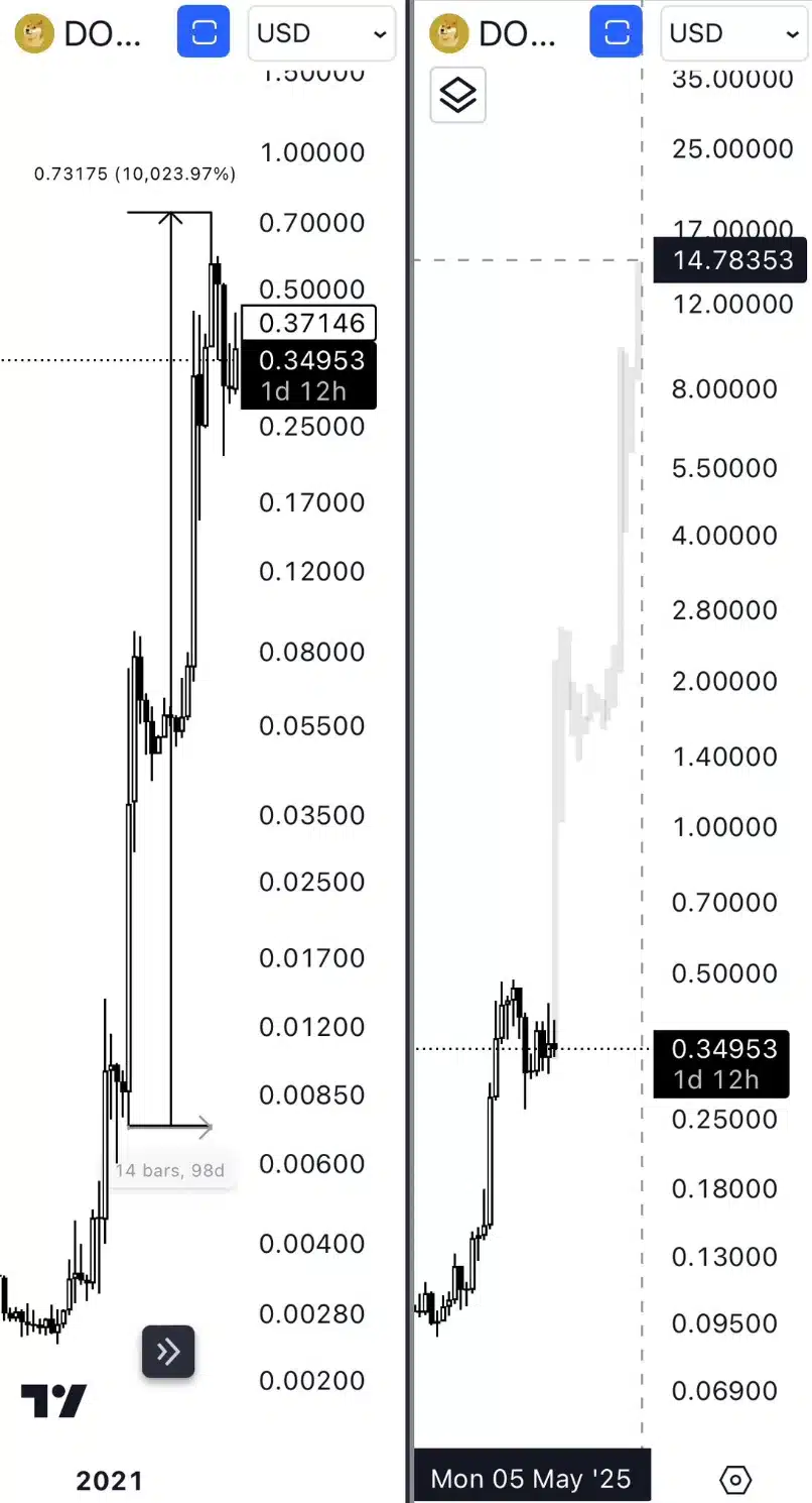 The crypto analyst suggests that if DOGE can replicate such bullish momentum, it could potentially reach $14.78 by May 2025.