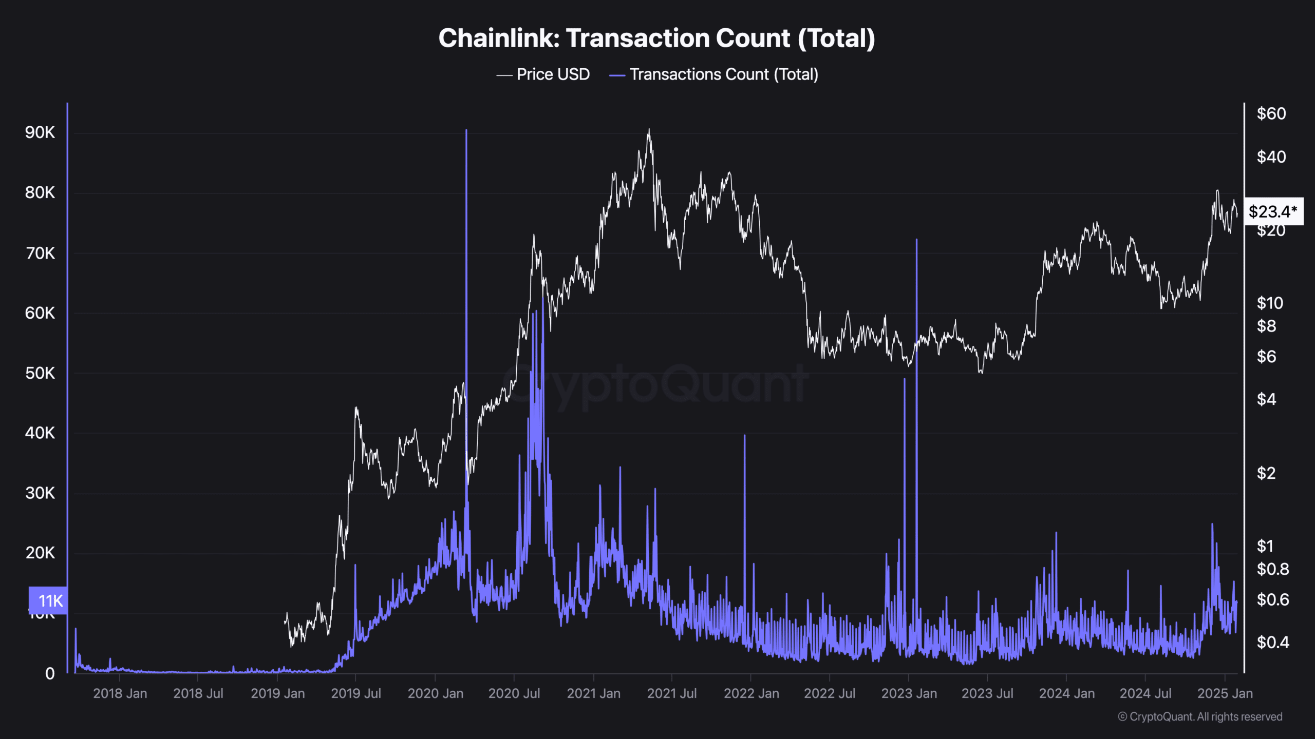 According to CryptoQuant data, Chainlink’s total transaction count is trending at 11K, reflecting moderate network activity compared to previous peaks.