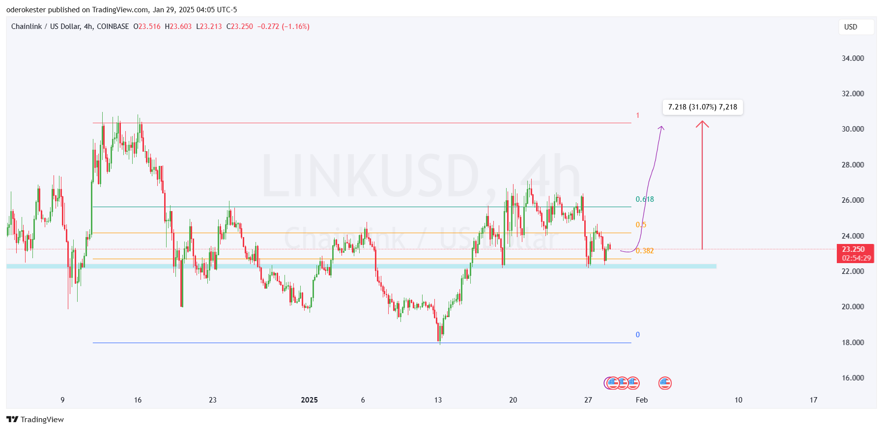 Technical analysis shows that holding above this level could provide a base for an upward movement. A potential rebound could push LINK toward the 0.5 Fibonacci level at $23.90, serving as an intermediate resistance.