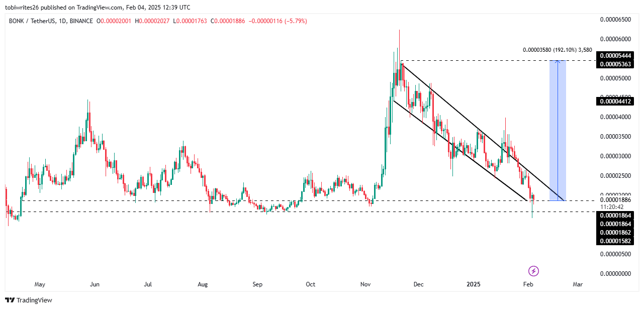 The channel now coincides with two major support levels at $0.00001862 and $0.00001582. If the current support level at $0.00001862 holds, BONK would have recorded approximately a 192% gain, reaching $0.00005444.