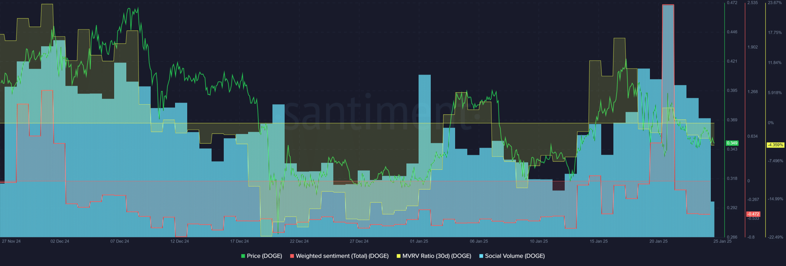 According to Santiment, the social volume rose between 13 and 21 January. Afterwards, it retreated into the weekend, indicating a slight decline in memecoin traction across all socials.