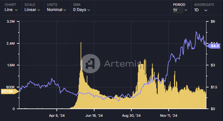 Solana had less than 1 million daily active addresses before March 2024. However, daily active addresses have since been hovering over 5 million daily active addresses in the last 2 months.