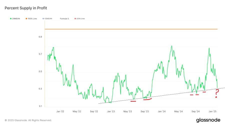 At the time of writing, Glassnode’s percent of supply in profit—used to measure the profitability of altcoins using a basket of 29 altcoins—shows that only 32% of these altcoins are in profit. This means about nine of these assets are profitable.