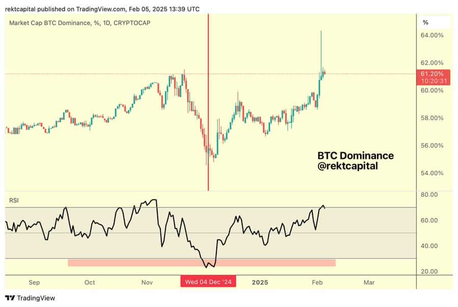 According to Rekt Capital, the current market movement of the Bitcoin Dominance chart doesn’t follow historic trends.
