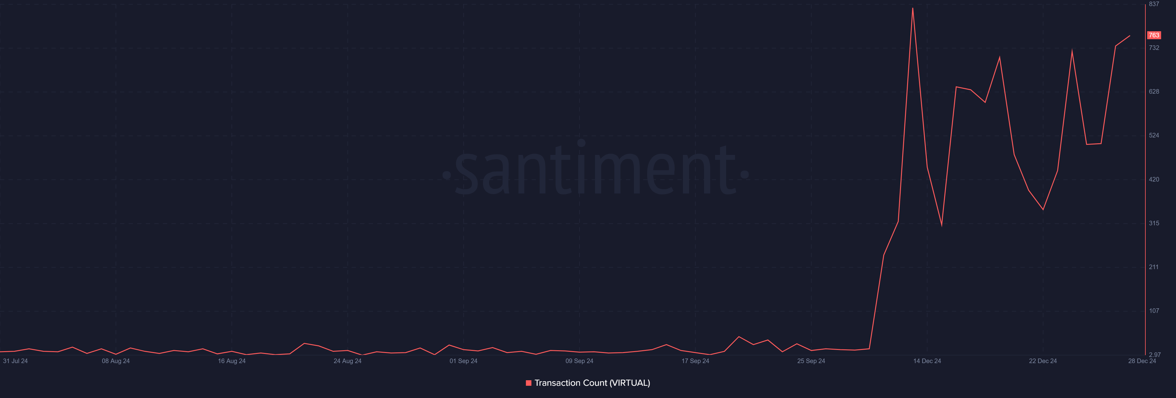 Transaction activity for VIRTUAL has experienced a significant increase, with the transaction count reaching 763 as of the latest data.