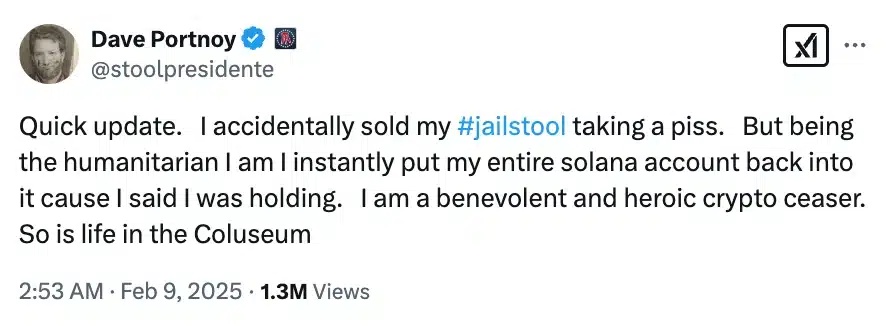 Since then, Portnoy has remained steadfast in his commitment, vowing not to sell a single JAILSTOOL token until it reaches “a $1 billion market cap.”
