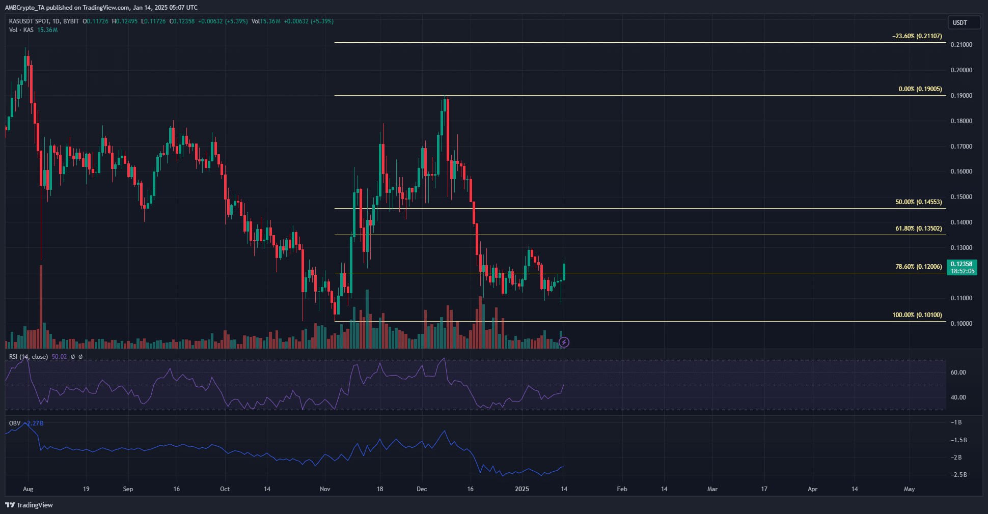 Kaspa [KAS] gained by 5.4% on Tuesday and it could be set for more gains soon. At the time of writing, it still had a bearish structure on the daily timeframe, but the bulls’ defense of the $0.11 region was solid. And yet, the swift retrace from the $0.19-level in December is a worry that has not been addressed yet.