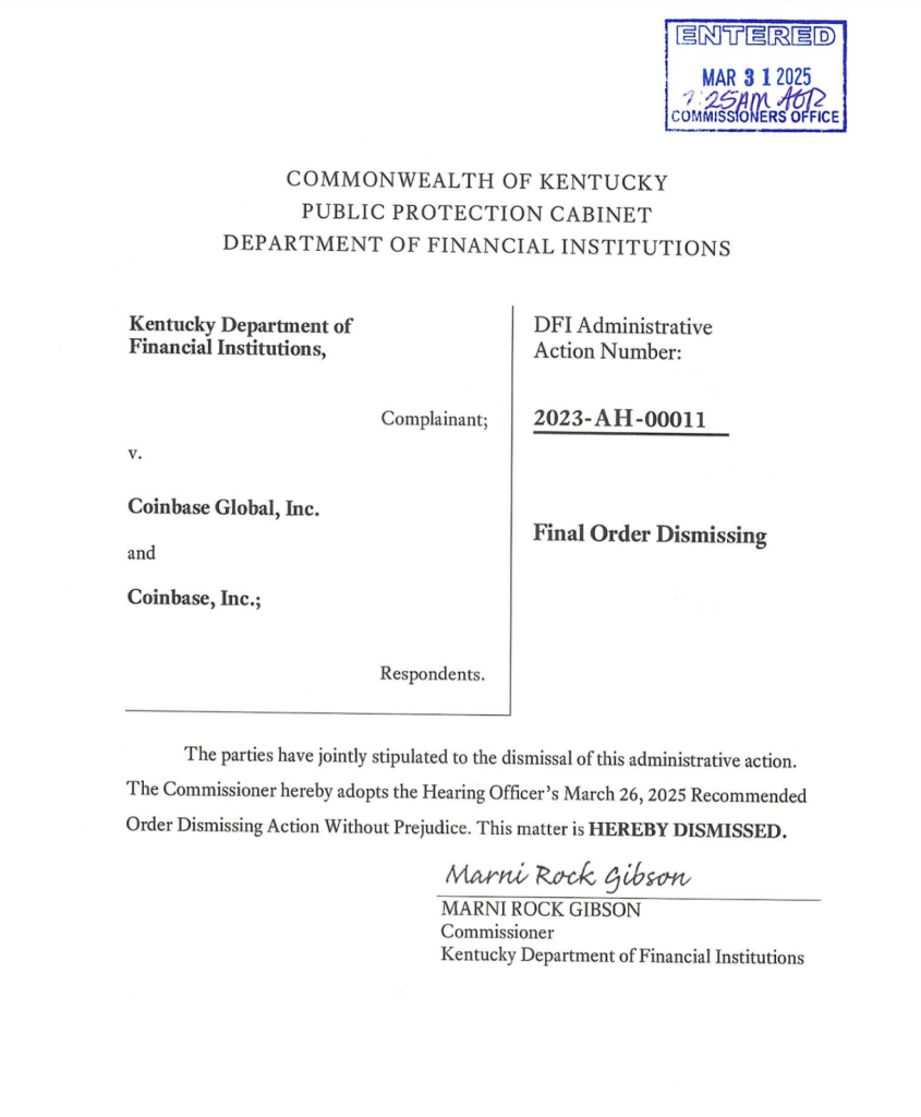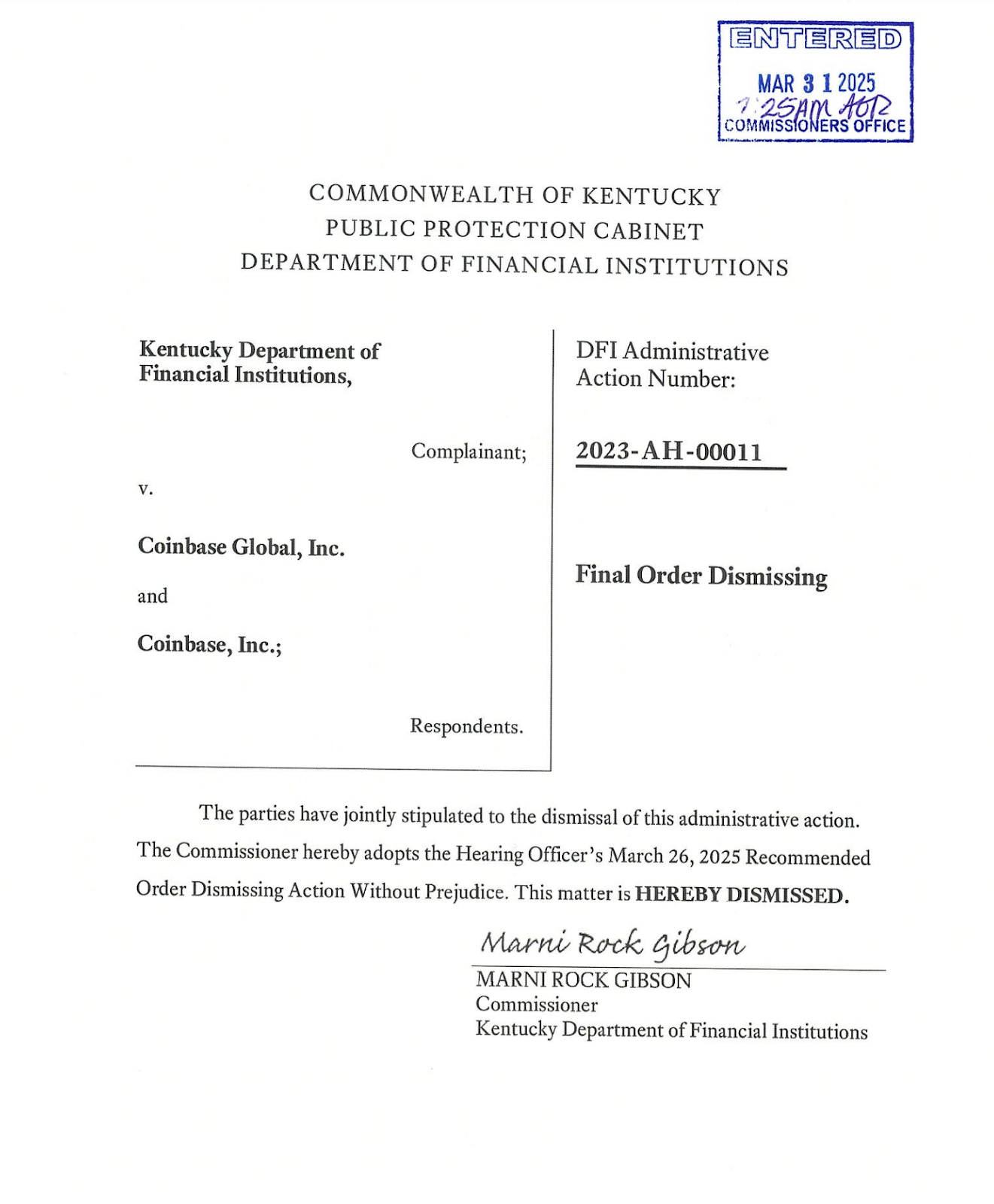 The Kentucky Department of Financial Institutions filed a joint stipulation of dismissal on March 31, ending its case against Coinbase for offering unregistered securities through its staking program.