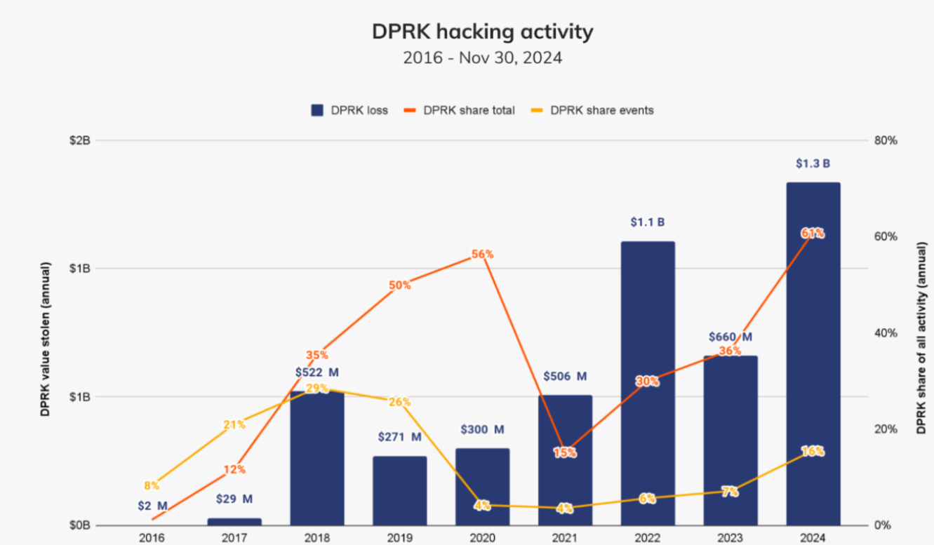 Throughout 2024, North Korean hackers stole over $1.34 billion worth of digital assets across 47 incidents, a 102% increase from the $660 million stolen in 2023, according to Chainalysis data.