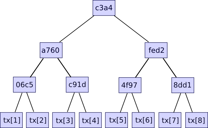 Additional data like the timestamp is also included in the block header, but this is not relevant here. Second, there is the transaction tree. Transactions in a Bitcoin block are stored in a data structure called a Merkle tree. The nodes on the bottom level of the tree are the transactions, and then going up from there every node is the hash of the two nodes below it. For example, if the bottom level had sixteen transactions, then the next level would have eight nodes: hash(tx[1] + tx[2]), hash(tx[3] + tx[4]), etc. The level above that would have four nodes (eg. the first node is equal to hash(hash(tx[1] + tx[2]) + hash(tx[3] + tx[4]))), the level above has two nodes, and then the level at the top has one node, the Merkle root of the entire tree.