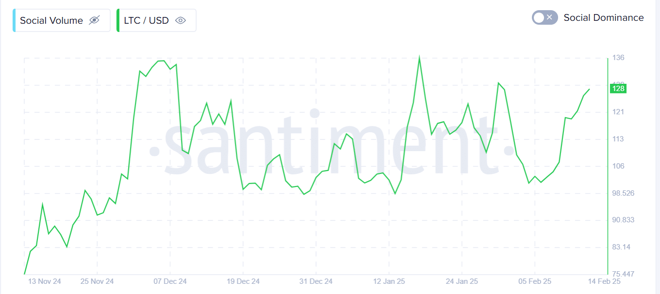Santiment data suggests optimism among investors, with LTC’s social volume rising from 100 to 128 in one week.