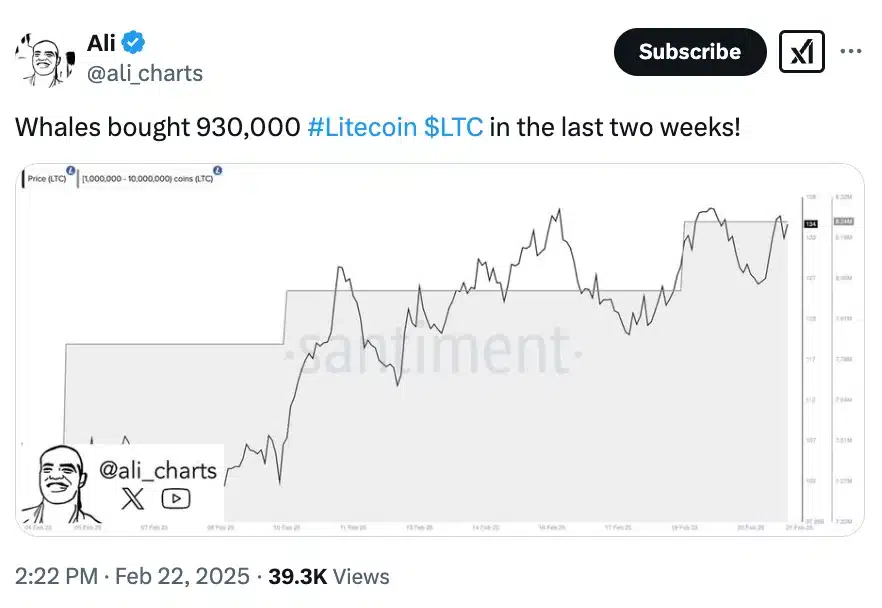 Remarking on the same, renowned crypto analyst Ali Martinez reported that nearly 1 million LTC tokens were accumulated over the last two weeks, signaling potential bullish momentum.
