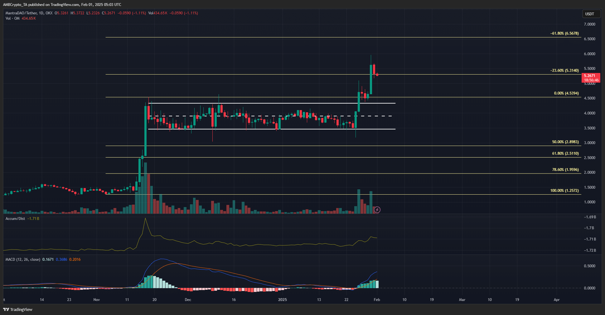 However, a price hike did not immediately follow the deal’s announcement. On the contrary, fast forward three weeks and soon, OM did hit a new all-time high. It climbed to an ATH of $5.96, before receding by 11% over the last few hours.