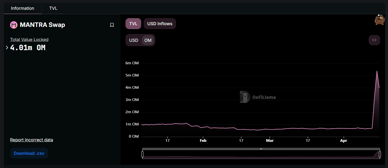 As per DeFillama data, Mantra’s TVL rose over 500% and reached 4.21 million OM (approximately $3.24 million) in a sudden spike as investors rushed to buy OM token at discount price and stake it on the protocol for expelled rewards.