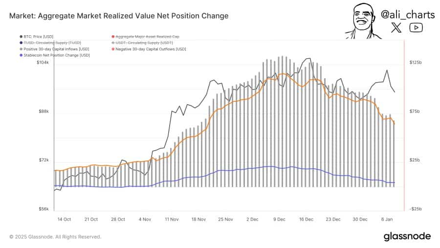 Meanwhile, the broader cryptocurrency market has also seen a sharp decline in liquidity. According to Glassnode’s Aggregate Realized Value Net Position Change metric, which measures liquidity inflows and outflows, liquidity has dropped by 49% over the past month, falling from $134 billion to $68 billion.