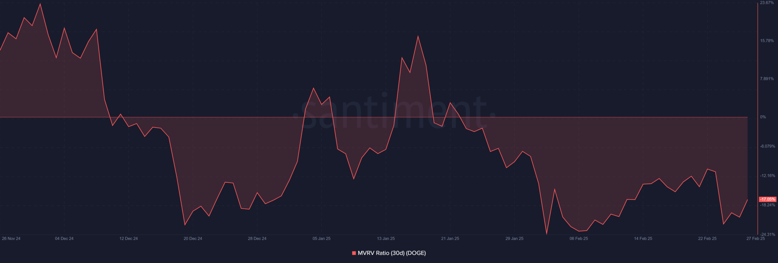 The ratio turned negative in mid-December 2024 and remained consistently below zero through the 27th of February, signaling persistent losses.