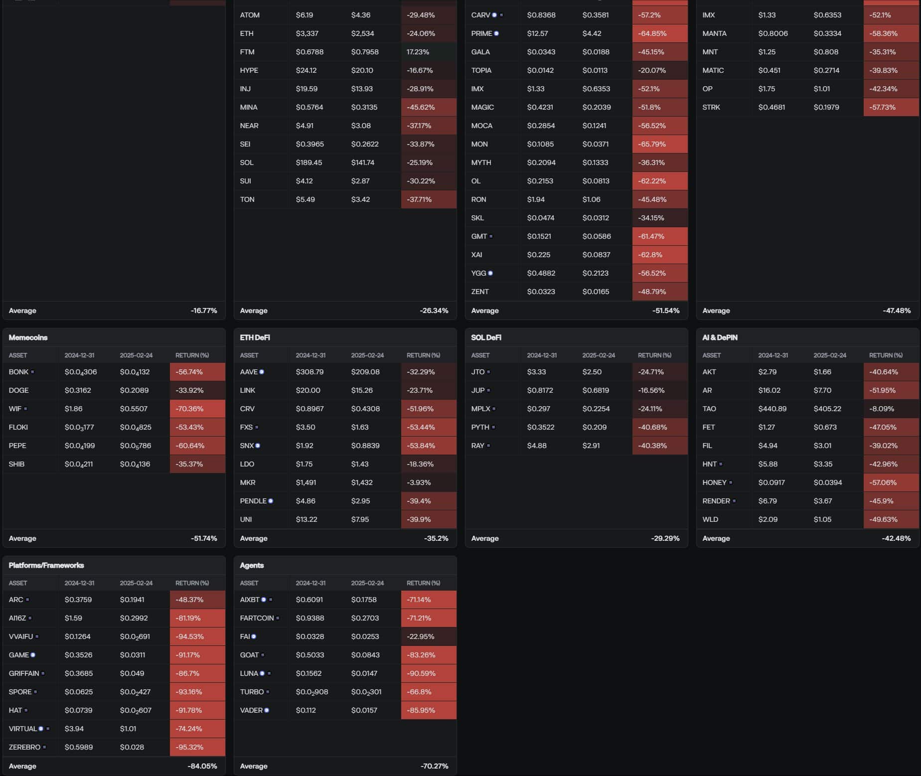 Memecoins, which surged in late 2024 with massive 90%+ monthly gains, have since crashed, now posting an average loss of 37.4% in February 2025 alone.