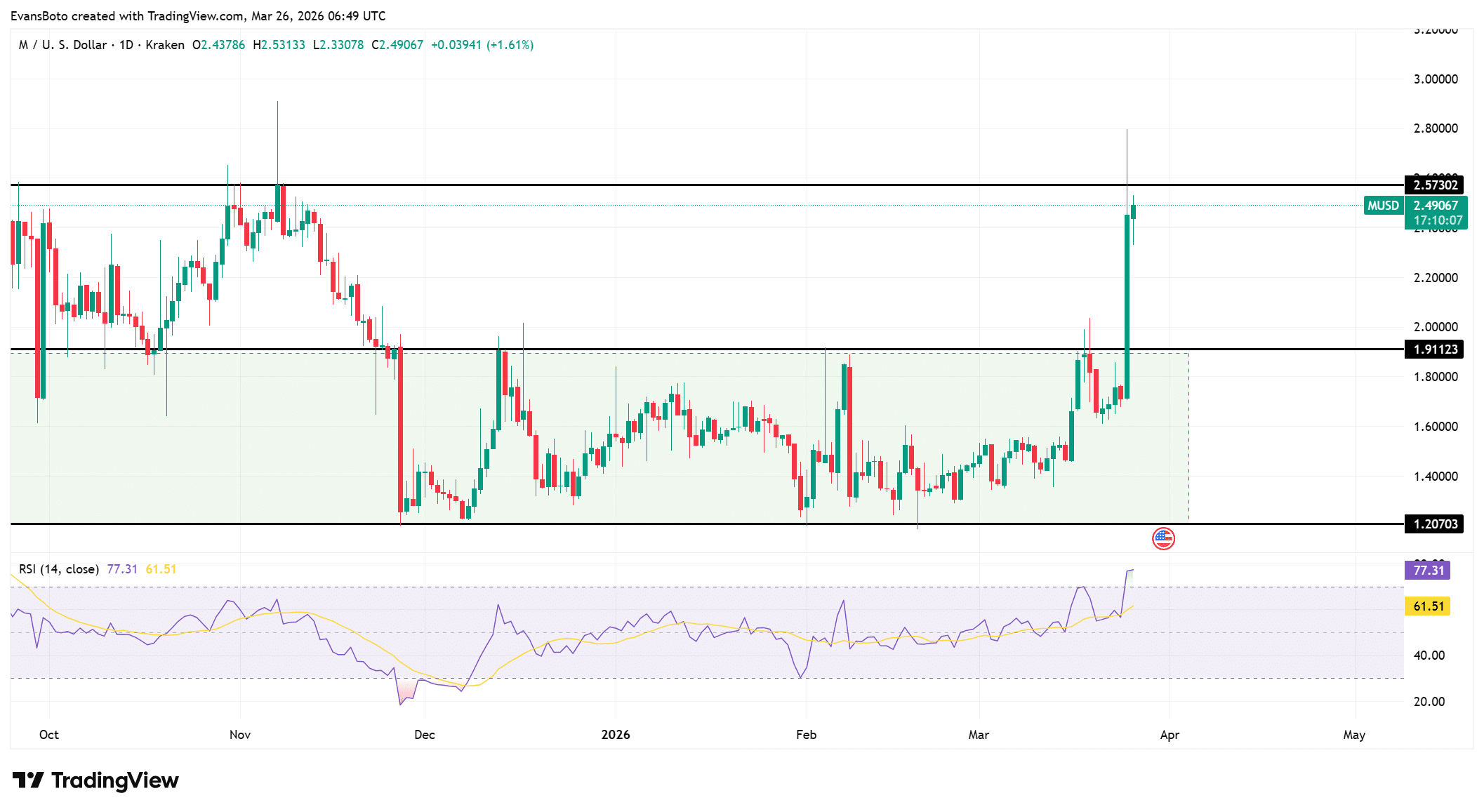 This level now acts as support, confirming a structural shift from consolidation to expansion. The chart shows a prolonged sideways range between $1.20 and $1.91 before the breakout, highlighting how compressed price action preceded the move.