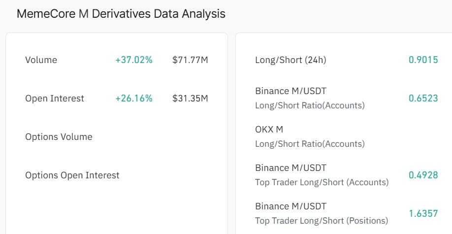 Memecore saw increased capital rotation as investors rushed to defend the market from further declines. At the same time, traders in the futures market aggressively placed short positions, further strengthening demand.