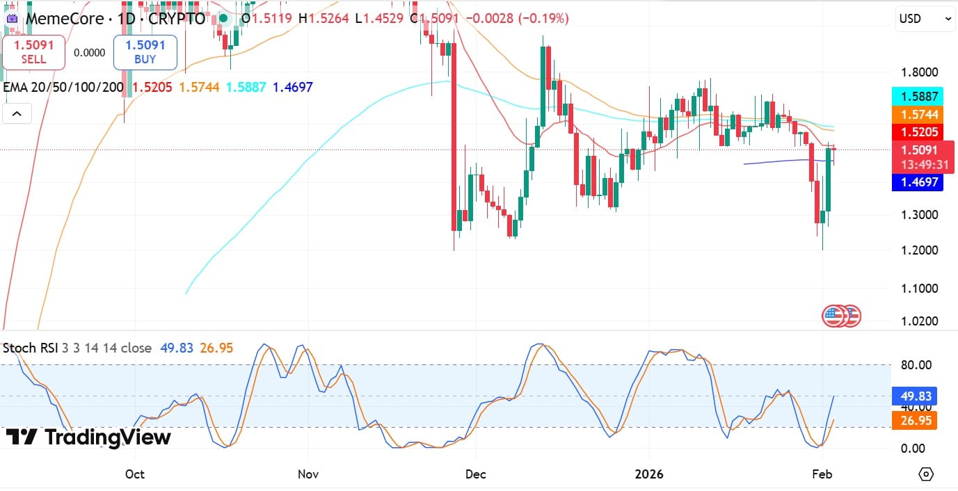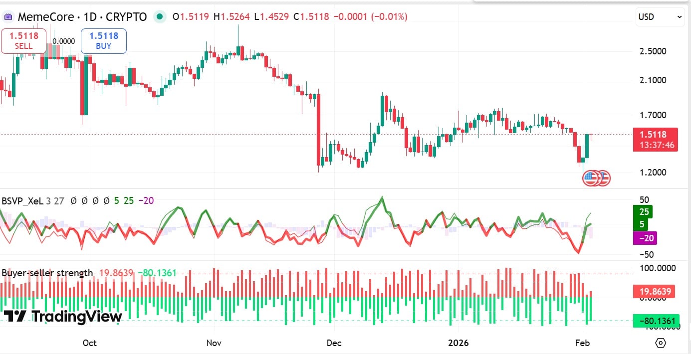 Memecore successfully defended the $ 1.20 support level, rising from $1.19 to a local high of $1.52, nearly erasing all recent losses.
