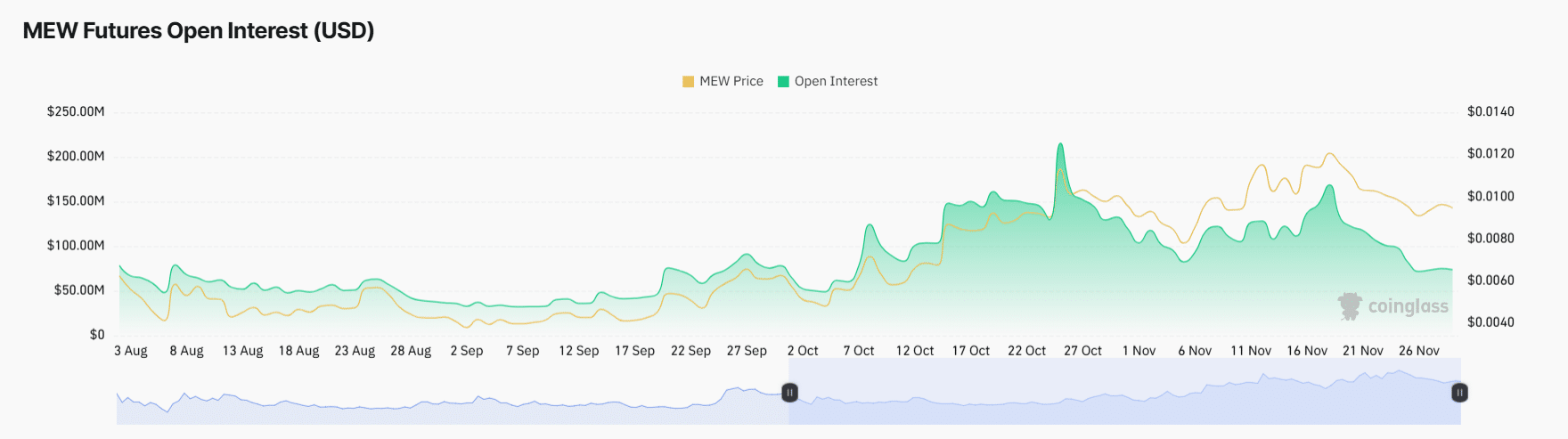 Open Interest in MEW Futures mirrored the price action, peaking at approximately $230 million during late October’s rally.