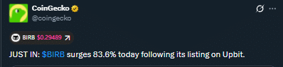 As per data from CoinGecko, BIRB surged over 83% upon listing on the Upbit exchange, Asia’s biggest crypto exchange.