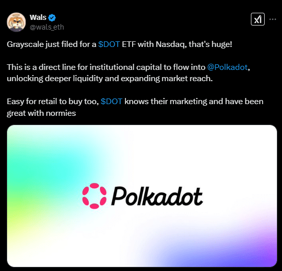 On X (formerly Twitter), reactions have varied. A crypto market observer described the filing as “huge” for institutional liquidity and predicted it could expand Polkadot’s market reach.